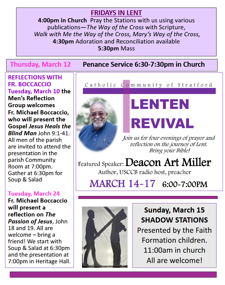 Wednesday (In the Church) Adoration 4 pm, Reconciliation 4:30-5:00 pm, Mass 5:30 pm